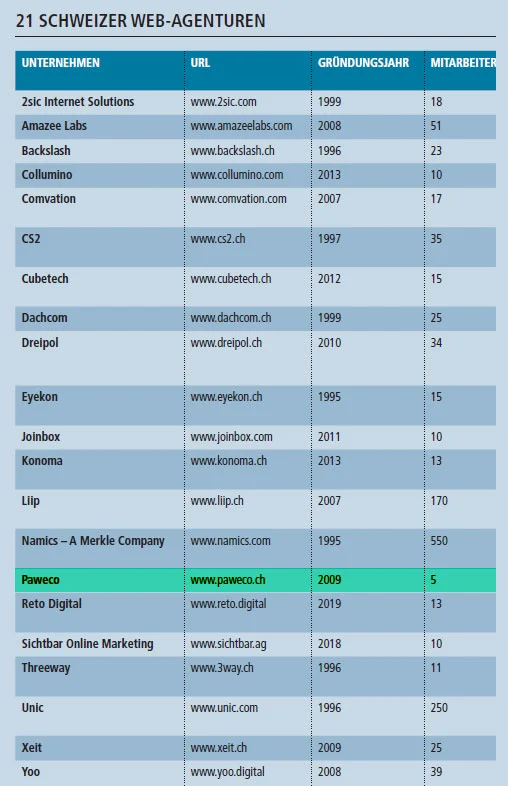 Und noch viele mehr haben es auf dem «Swiss IT Magazine» unter die Top 21 der Schweizer Web Agenturen geschafft. Wir freuen uns sehr, dass wir mit «PAWECO» auch mit dabei sind. Gerne bedanken wir uns bei unseren Kunden, denn ohne sie hätten wir dies nicht geschafft.